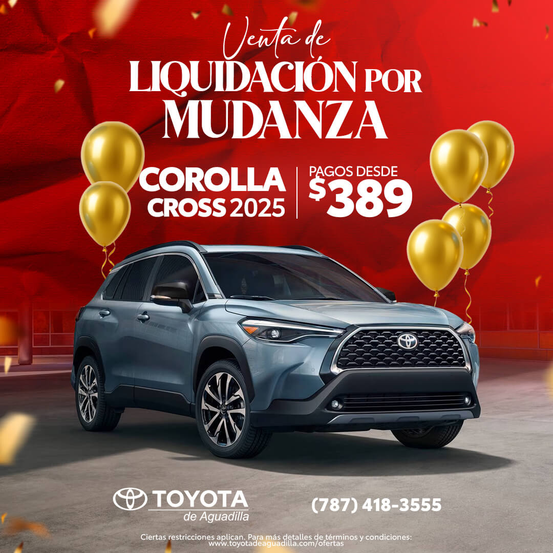 Toyota Corolla Cross: Pagos mensuales desde $389, aplicables únicamente a clientes que cualifiquen para financiamiento aprobado. Ejemplo basado en términos estándar de financiamiento; las condiciones reales (tasa de interés, pronto pago, balance financiado, seguros, etc.) pueden variar según cada cliente.