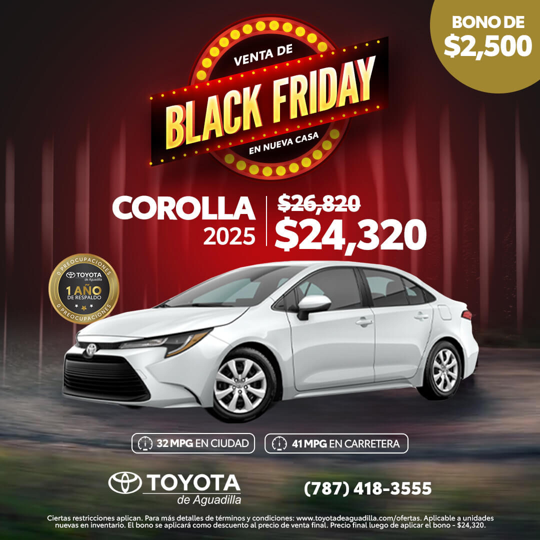 Toyota Corolla Sedan (código 1695) - Precio final: $26,820 / $2,500 de bono. MPG estimado: 32 ciudad / 41 carretera. Aplicable a unidades nuevas en inventario. El bono se aplicará como descuento al precio de venta final. Precio final luego de aplicar el bono - $24,320