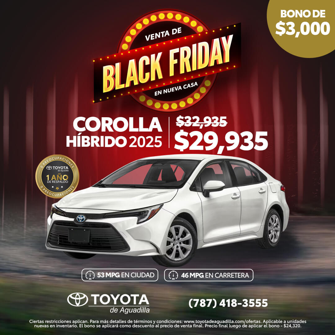 Toyota Corolla Híbrido Sedan (código 1693) - Precio final: $32,935 / $3,000 de bono. MPG estimado: hasta 53 ciudad / 46 carretera. Aplicable a unidades nuevas en inventario. El bono se aplicará como descuento al precio de venta final. Precio final luego de aplicar el bono - $29,935