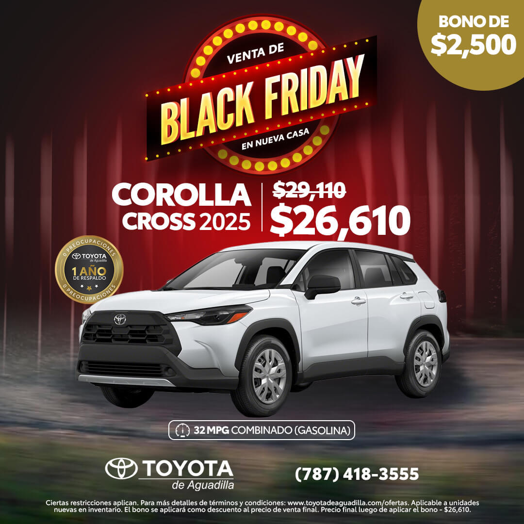 Toyota Corolla Cross (código 6380) - Precio final: $29,110 / $2,500 de bono. MPG estimado: 32 combinado (gasolina). Aplicable a unidades nuevas en inventario. El bono se aplicará como descuento al precio de venta final. Precio final luego de aplicar el bono - $26,610